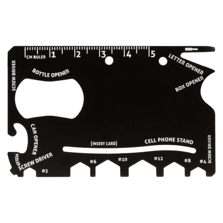 Dodatkowe informacjeNarzędzie wielofunkcyjne w etui, 9 funkcji: linijka, mini wkrętak, otwieracz do kartonu, 2x wkrętak, klucze płaskie (#2, #4, #6, #8, #10, #12), podstawka pod telefon (karta nie jest dołączona), otwieracz do puszek, otwieracz do butelek