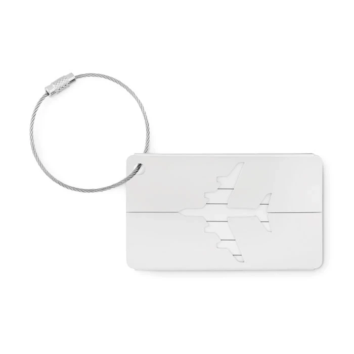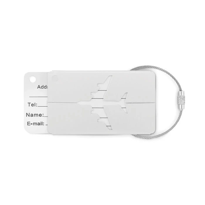 Aluminiowa przywieszka na bagaż lotniczy z etykietą na nazwisko i adres. W komplecie uchwyt.